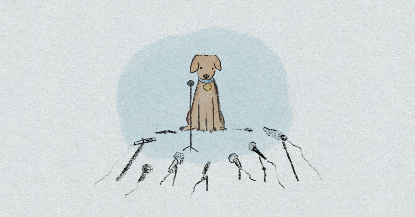 Human media outlets have gathered with lights and cameras. Attention is focused at the front of a packed room where several dogs are seated. A golden retriever walks to the center microphone. Around his neck, a tag on a collar with simple text reveals that his name is Biscuit.