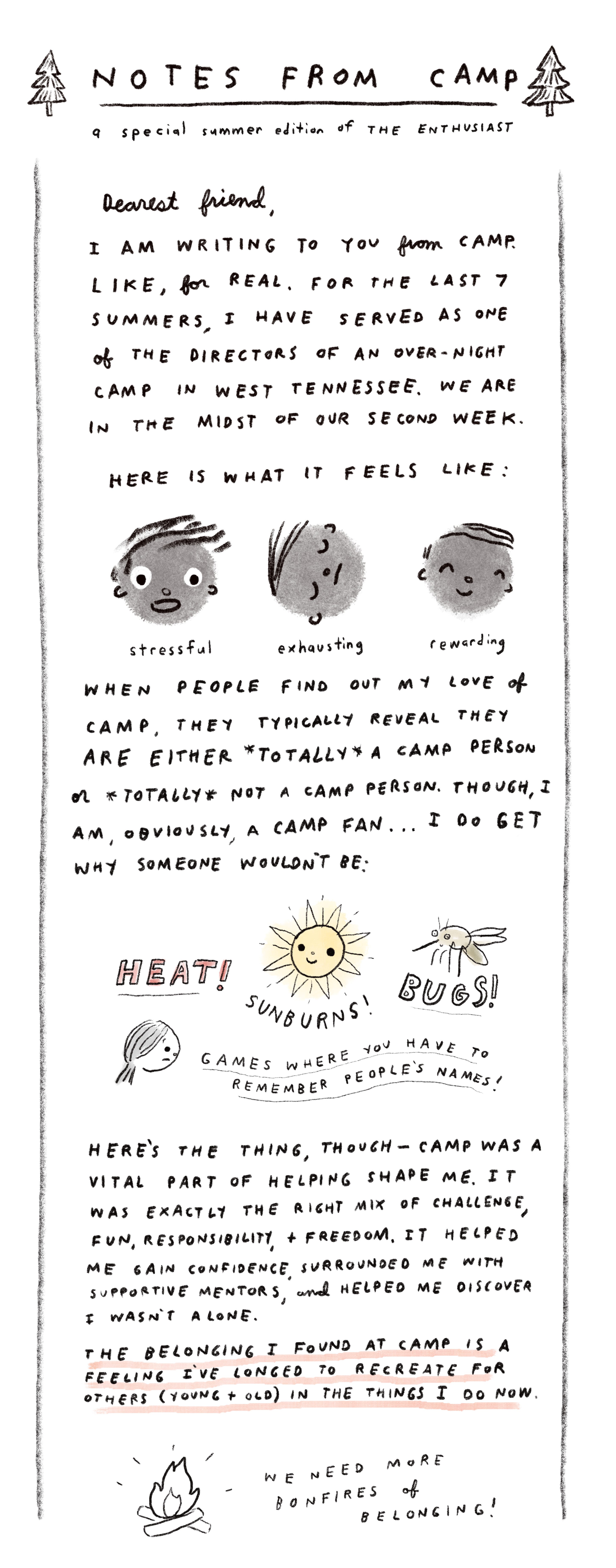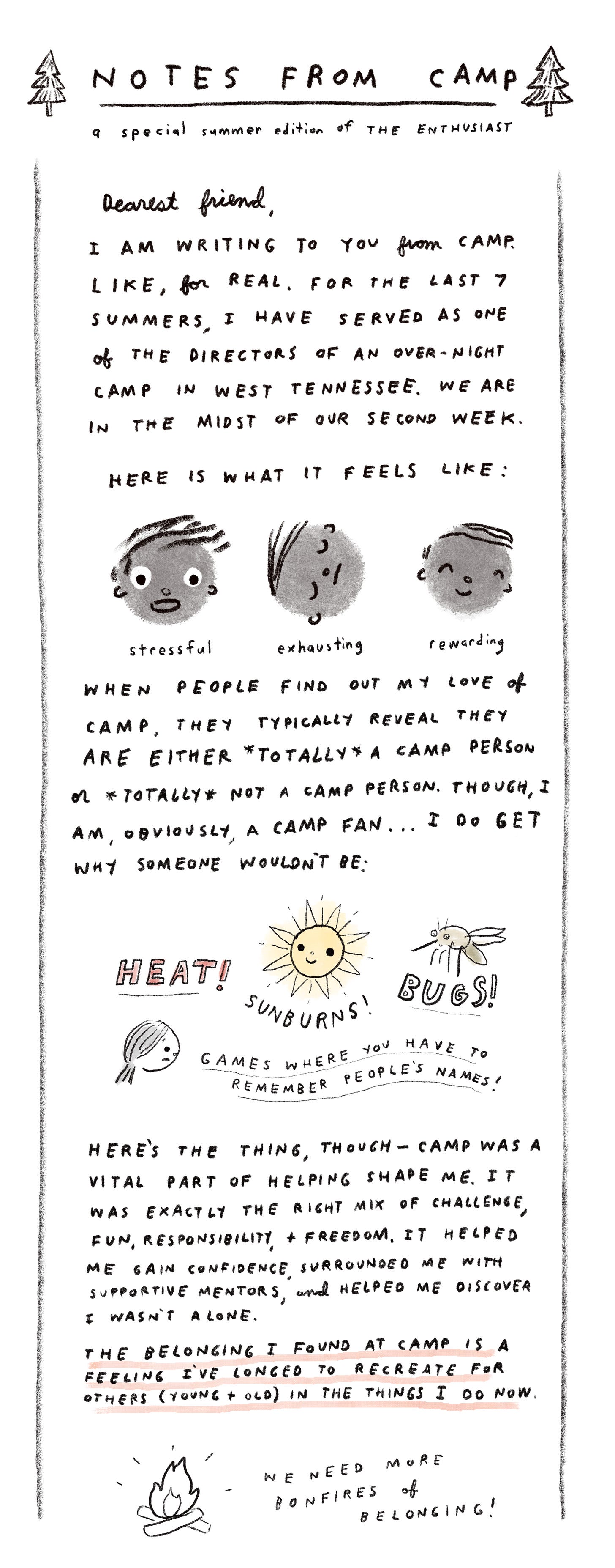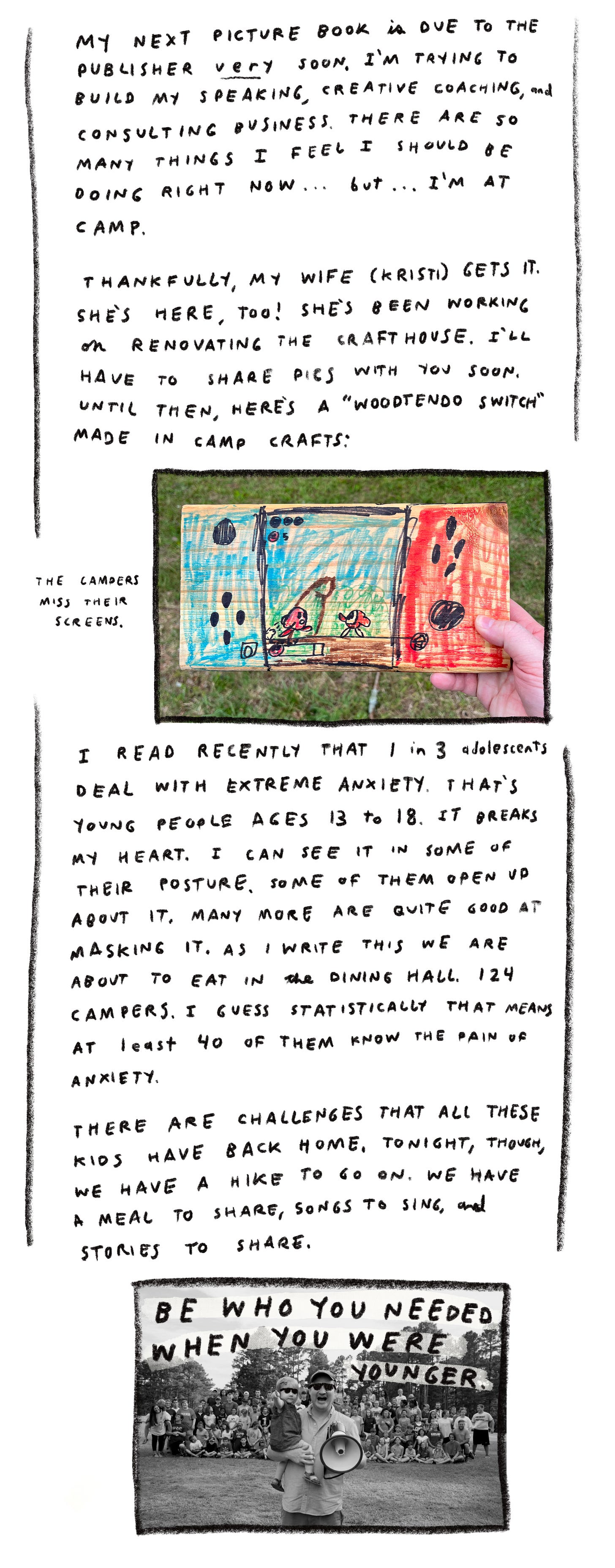 Over the next few weeks, I’ll be sharing a few notes from camp. As mentioned above, it’s extremely tiring, occassionally stressful, but ultimately so incredibly rewarding. Hearing from each of you helps keep me going! Thank you *so* much to all who have subscribed, shared, donated, and cheered this on. You are each daily reminders to me of the incredible goodness that’s possible in the world. Truly.