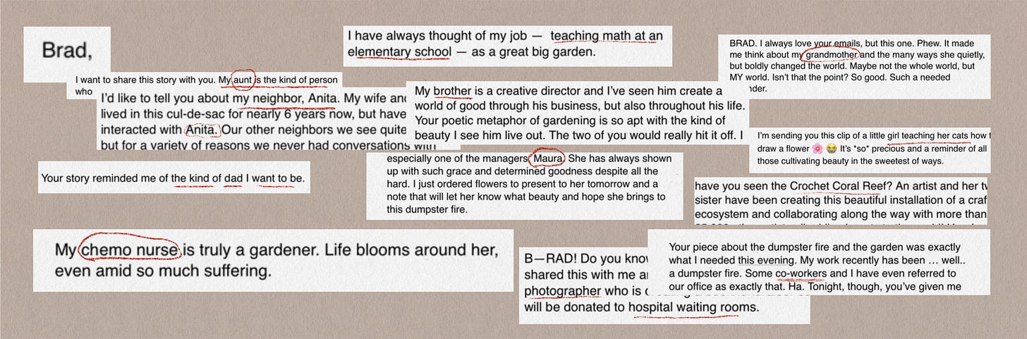 Last week, I shared the story of the dumpster fire and the garden. So many of you responded with beautiful stories about real-life gardeners of good:
